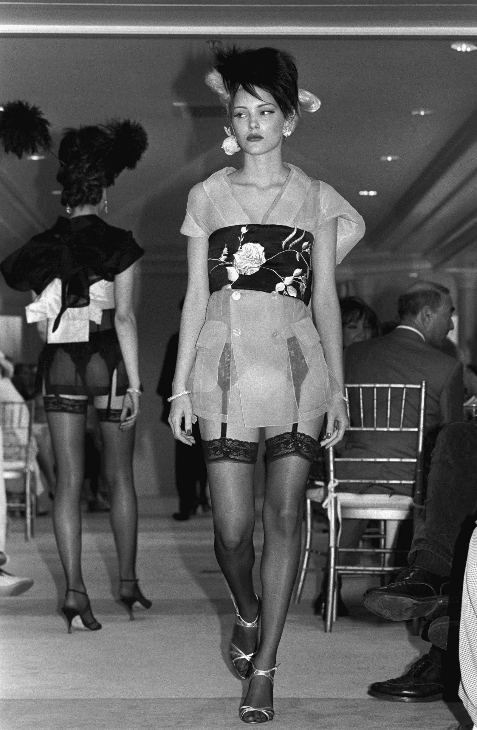 Porté par de nouveaux soutiens et accueilli dans l’hôtel particulier de Maria “São” Schlumberger, Galliano livre une collection flamboyante, fusionnant Orient et Occident, kimonos et glamour des années 1940. Le porte-jarretelles y apparaît comme un fil tendu entre fragilité et puissance. Une déclaration esthétique, mais aussi personnelle. Le début d’une légende.