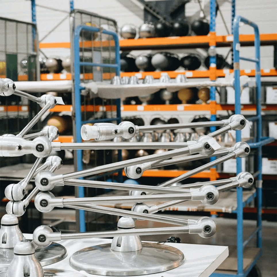Inspiré par les lampes articulées existantes, comme l’Anglepoise ou la Gras, Domecq en perçoit rapidement les limites techniques. Il conçoit alors un objet robuste, modulable et réparable, où chaque pièce a une fonction précise et peut être remplacée. Un design pensé pour durer, à rebours de toute logique d’obsolescence.