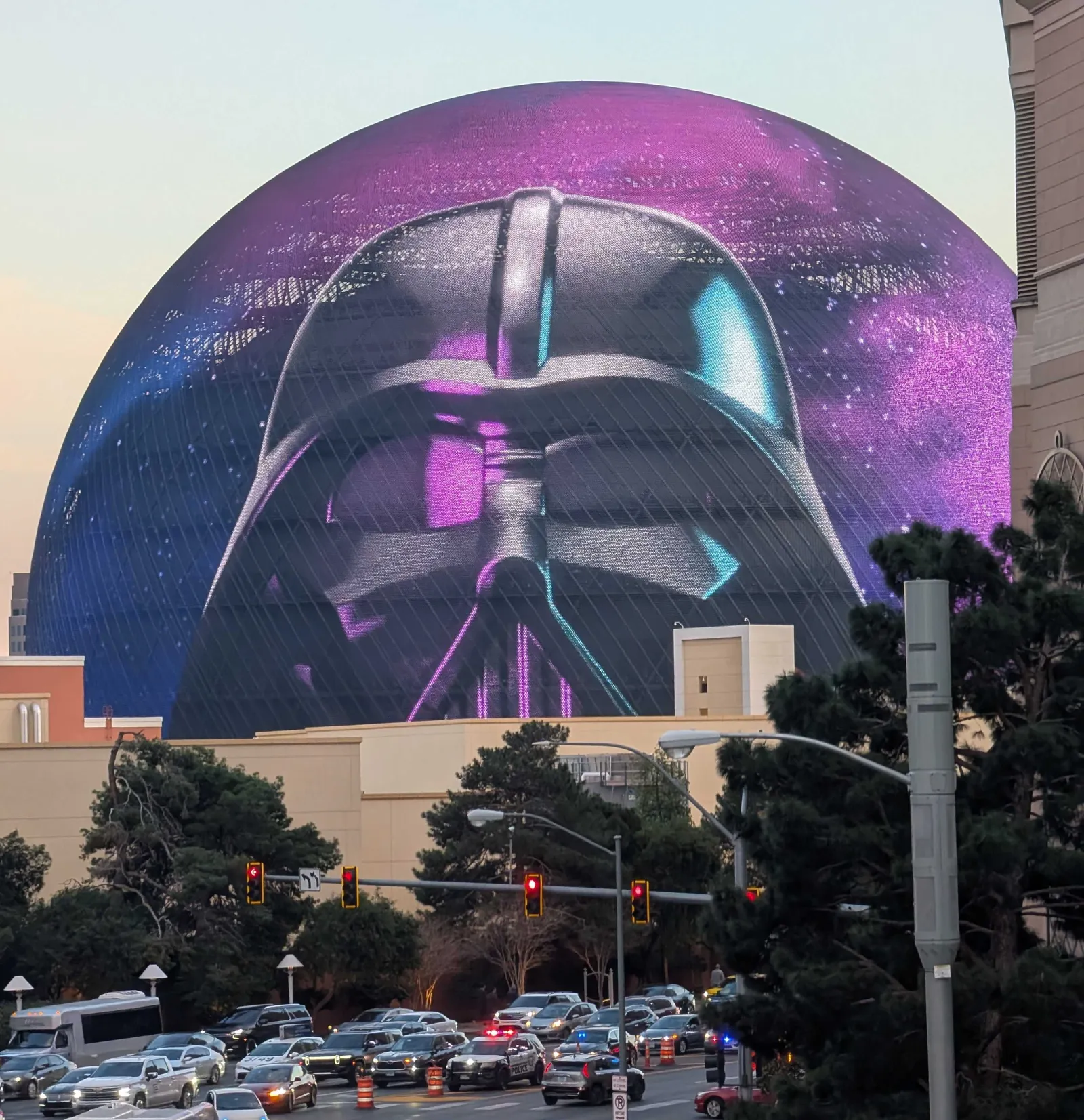 Dark Vador de LEGO domine Las Vegas depuis The Sphere. L’entreprise a acheté un espace publicitaire pour promouvoir son nouveau système Smart Play. © Michael Calore